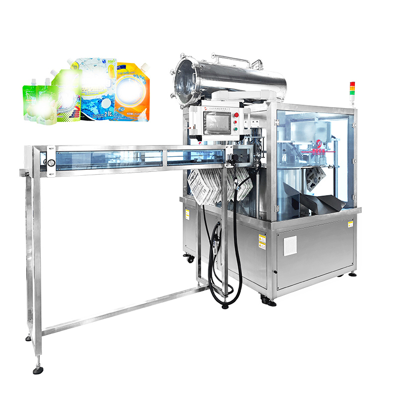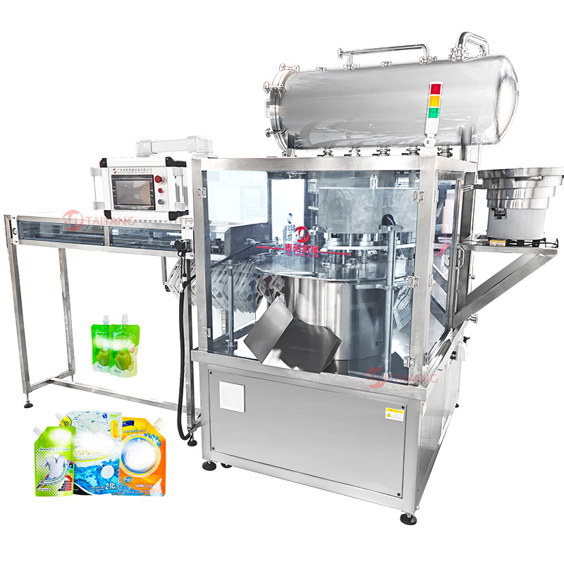 Taiyang Vierkopf-Ausgussbeutelfüllung und Capping-Maschine eignet sich für gepackte Produkte in der täglichen Chemikalie- und Lebensmittelindustrie wie Waschmittel, Shampoo, Gelee, Milch usw.